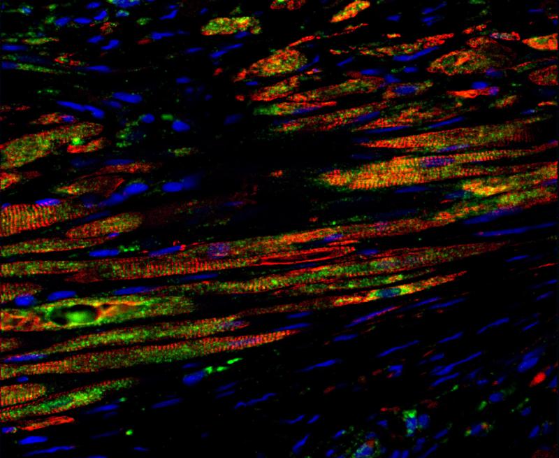 Bei diesem Bild zeigt Grün die von den transplantierten Stammzellen neugebildeten Myozyten. Rot stellt Myozyten dar, Blau die Zellkerne. Rot und Grün zusammen bedeutet, dass die transplantierten Stammzellen neue Myozyten gebildet haben. (Journal of the American College of Cardiology / Elsevier)